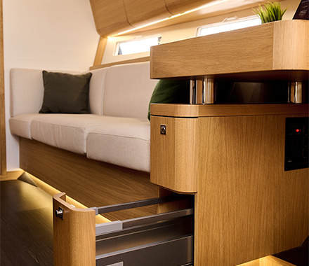 Il en résulte un intérieur incomparable où la lumière naturelle vient souligner un design résolument moderne au service du confort et de la fonctionnalité en navigation.